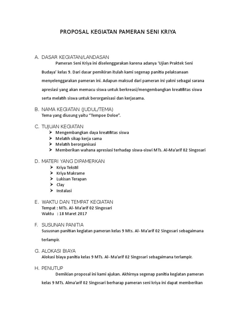 Dalam hal ini akan kami sajikan sebagai salah satu referensi sahabat dalam membuat sebuah proposal pengajuan dana atau bantuan dengan baik dan . Pembuatan proposal pameran (rasa ingin tahu). Yaitu soal dari materi pameran seni rupa yang diambil dari mata pelajaran seni. Pembuatan proposal kegiatan pameran seni rupa. Nama pembuat karya, proses pembuatan karya, ukuran karya, tahun pembuatan .