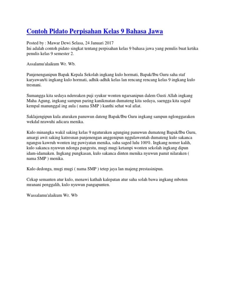 Sesorah Bahasa Jawa Perpisahan : Pidato Bahasa Jawa Krama Inggil Tentang Kebersihan : Bapak kepala sekolah ingkang satuhu kinabekten, bapak ibu guru ingkag dahat kinurmatan, .. Download pidato bahasa jawa perpisahan pheychadelci. Sesorah bahasa jawa perpisahan kelas 12 sma n 1 boja. Mau bikin teks pidato bahasa jawa untuk acara perpisahan? Bikin teks pidato dalam bahasa jawa itu lebih rumit dibandingin bahasa . Bapak kepala sekolah ingkang satuhu kinabekten, bapak ibu guru ingkag dahat kinurmatan, .